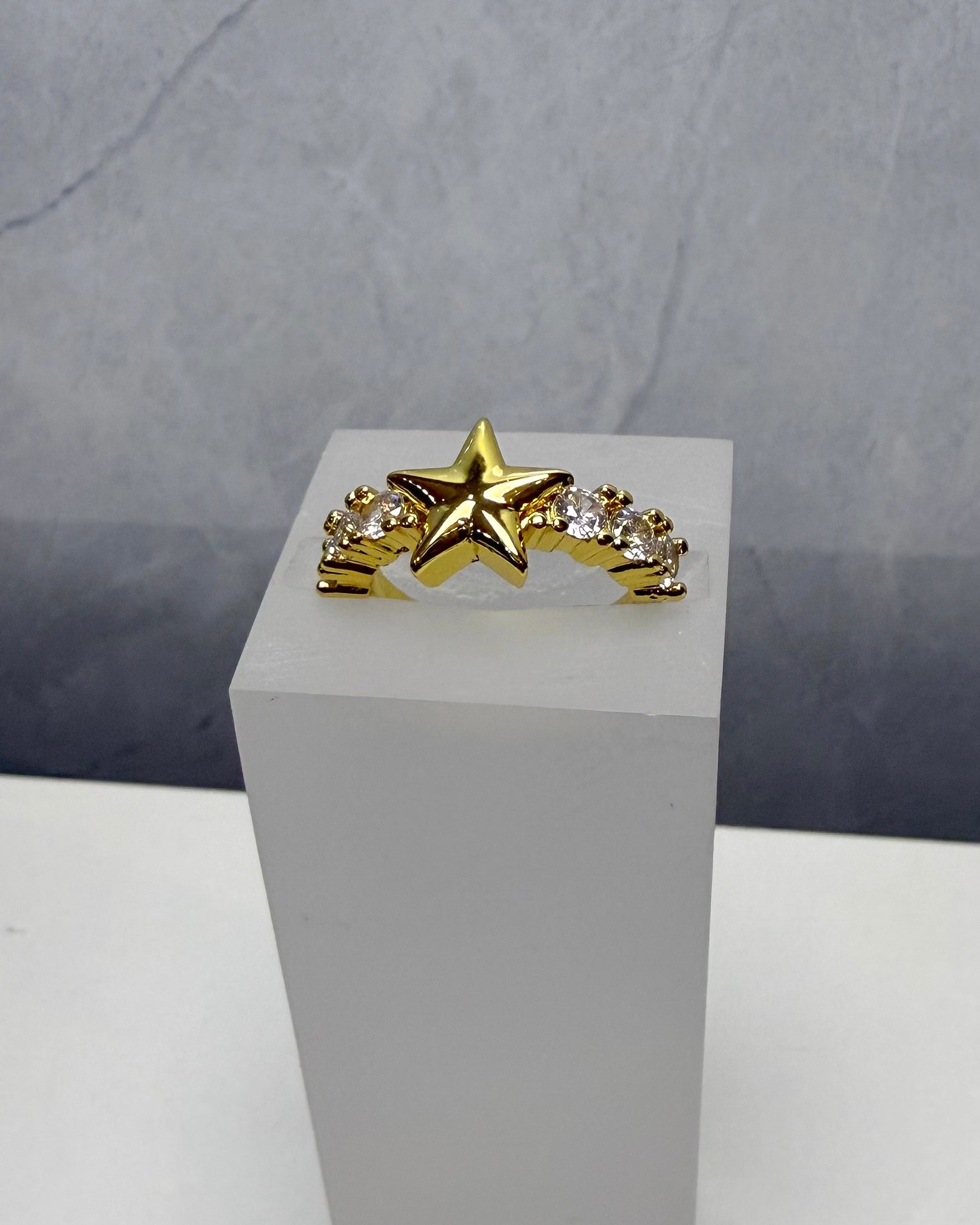 Bello anillo con cristales a los lados con forma de estrella en el centro ajustable.chapa de oro