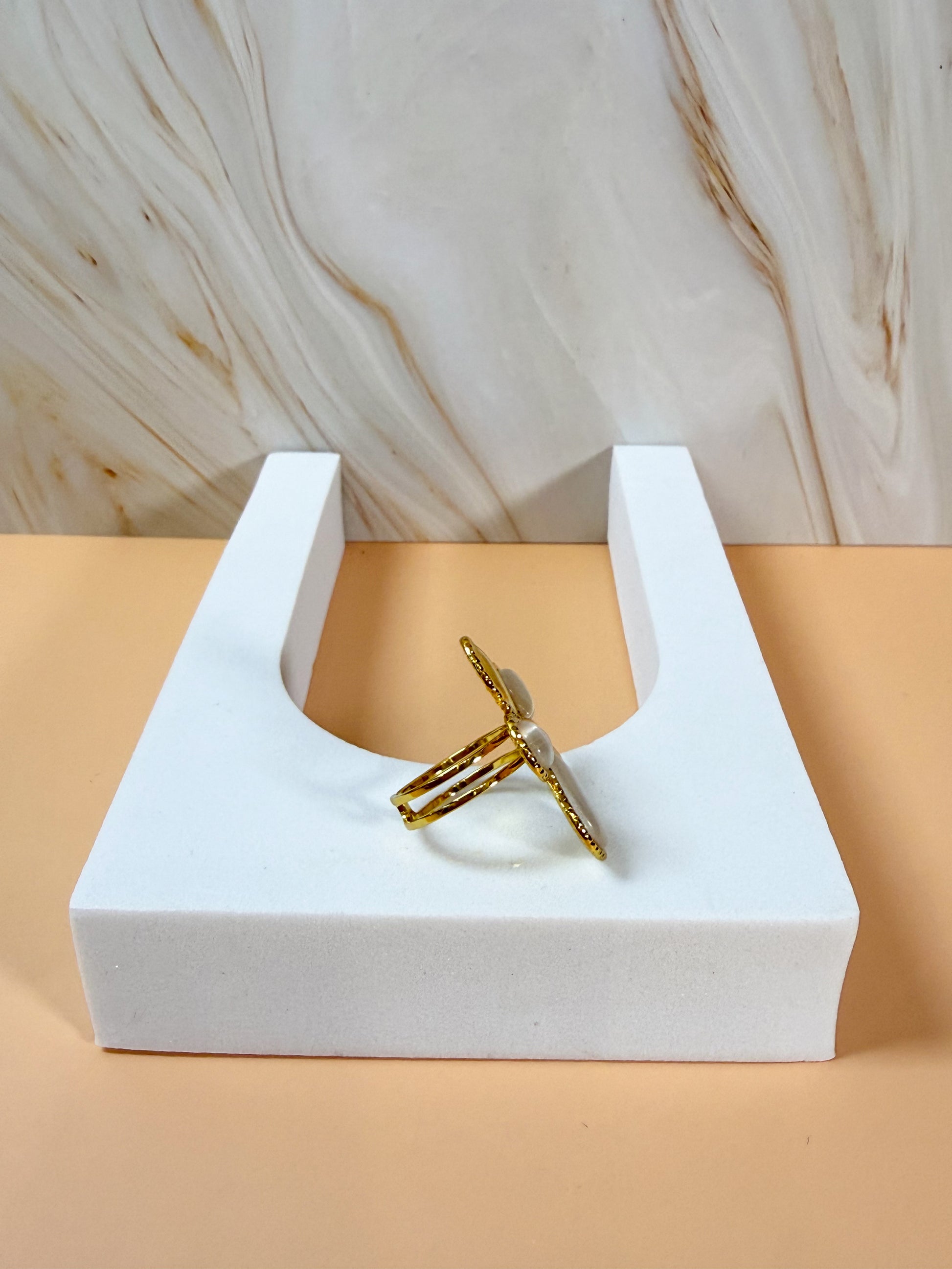lindo anillo en tono dorado en forma de flor con detalles de piedras y ajustable , para darle un toque a tus manos .De acero inoxidable ✨