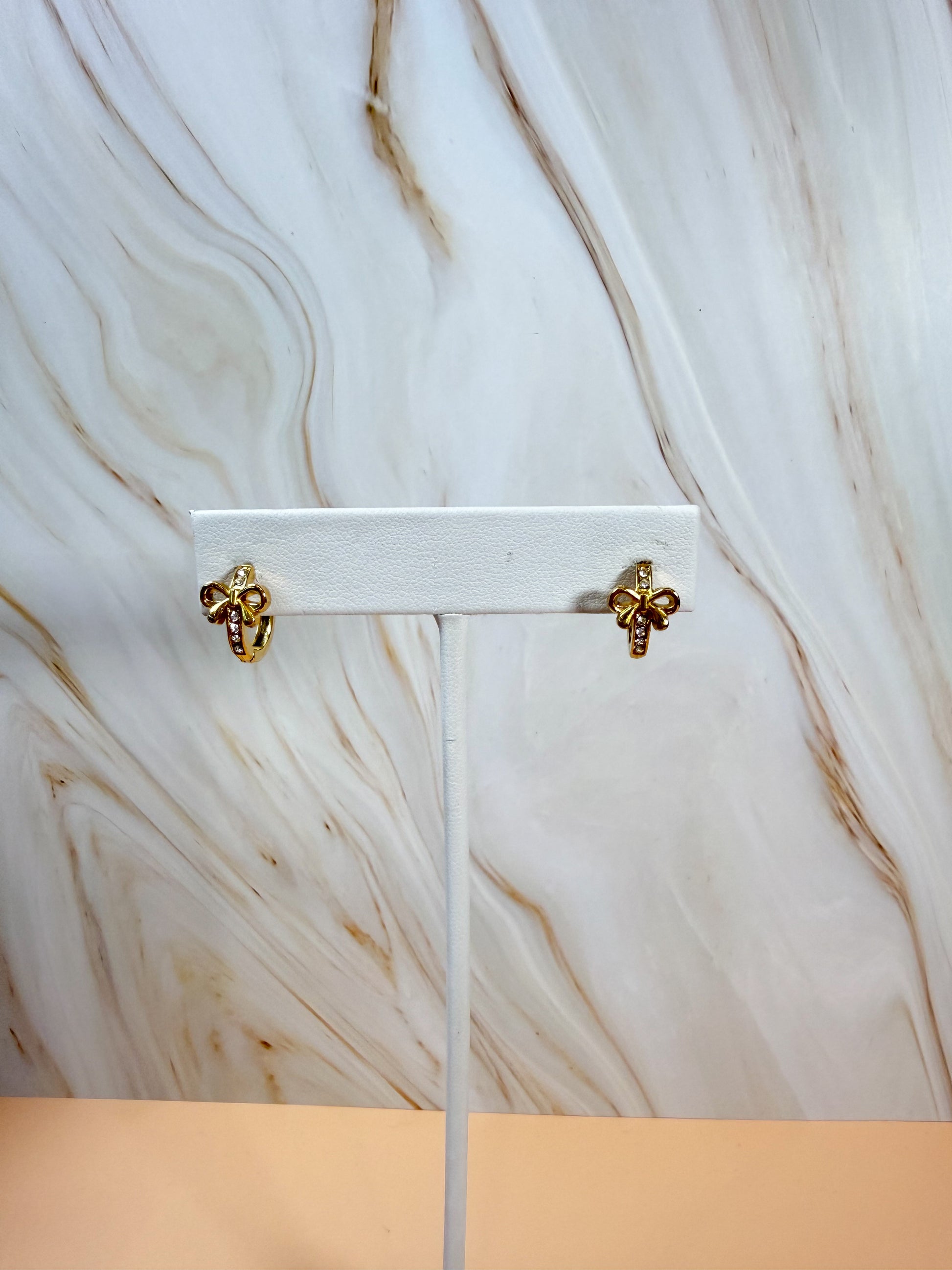 Aretes en tono dorado con detalle de moño y brillito , lindo y sutil para el día a día ✨ en acero inoxidable