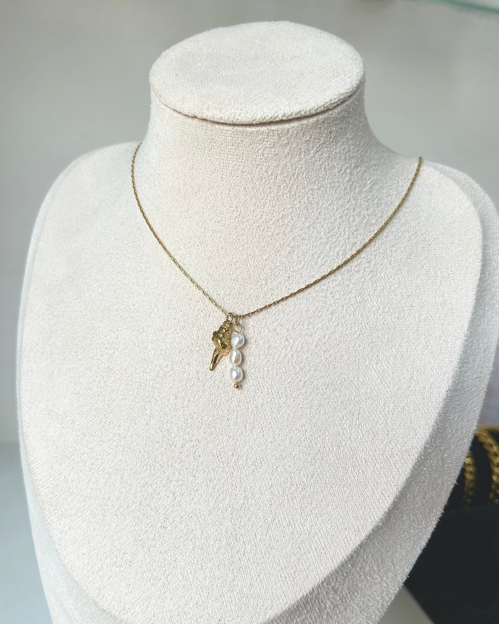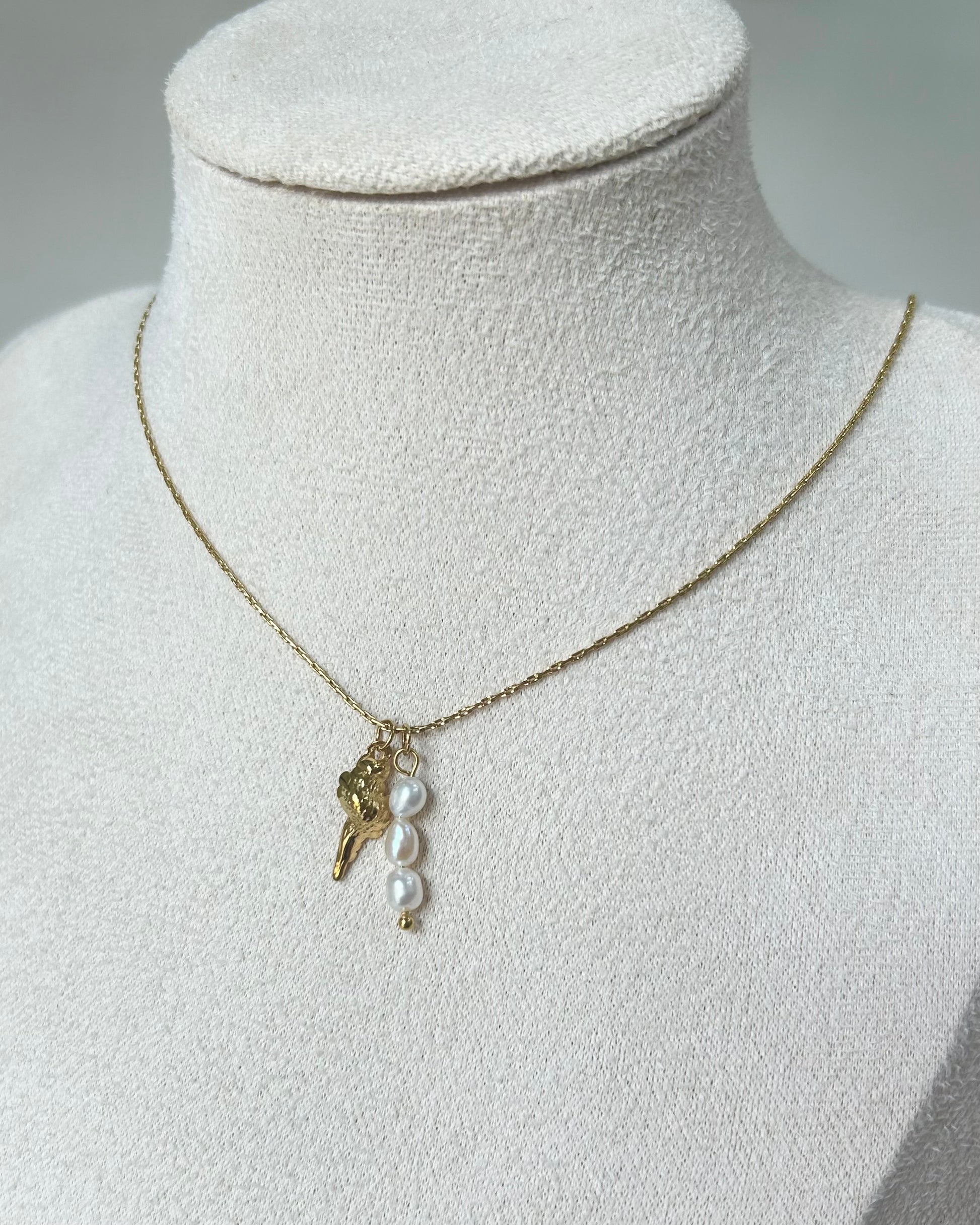Collar con dije de caracol, y dije de perlas de río en mini, acero inoxidable.