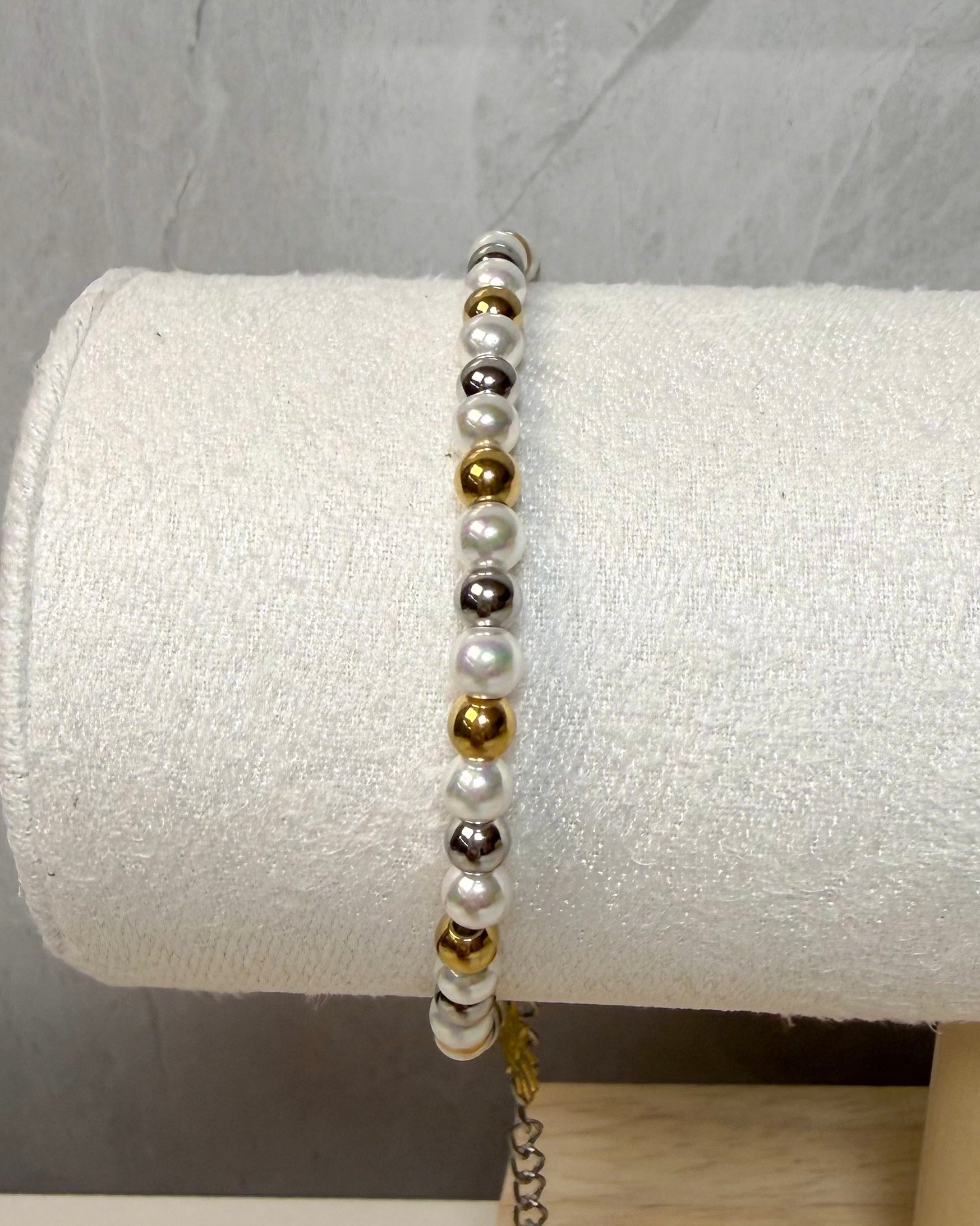 pulsera con detalles de bolitas en blanco, dorado y plateado , nice para darle ese toque a tus looks y verte mas linda. En acero inoxidable