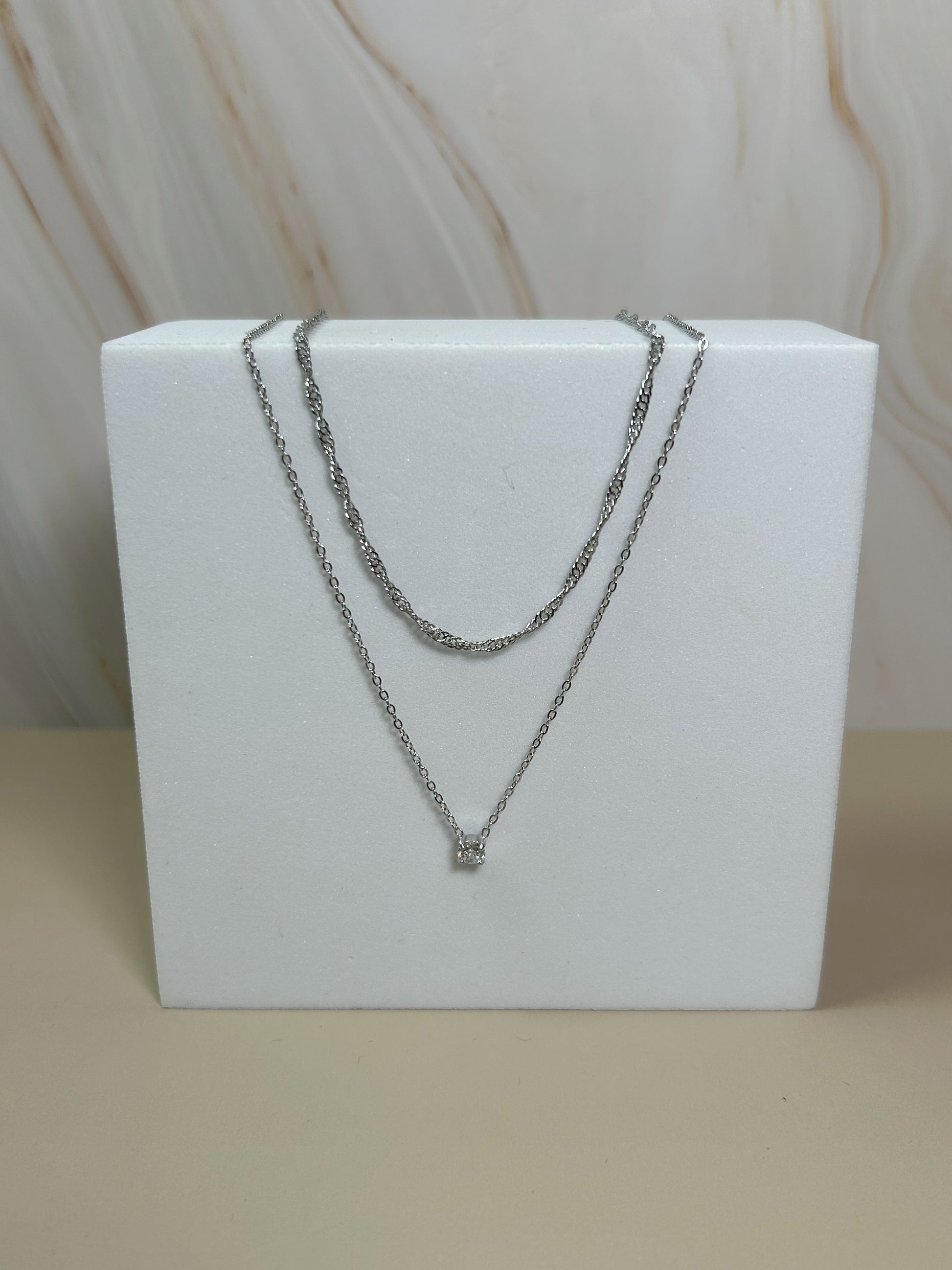 bello collar doble en tono plateado con detalle de cristal en medio ideal para todo tipo de looks. De acero inoxidable ✨