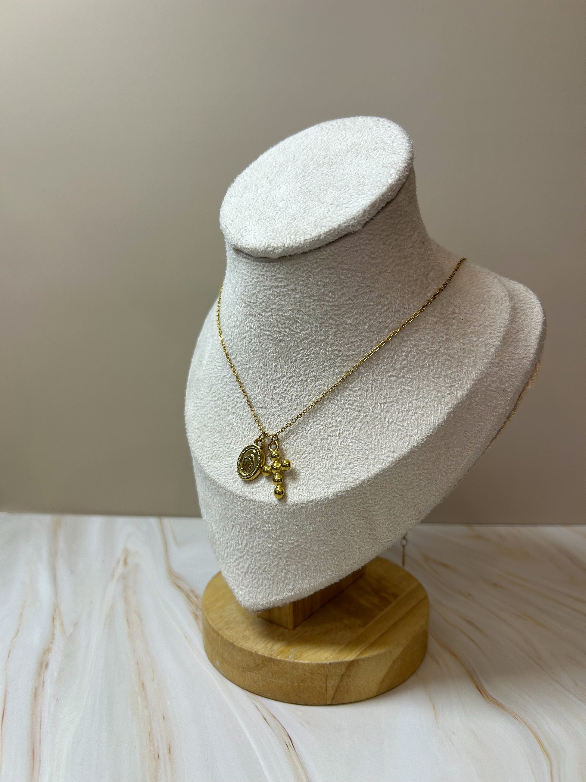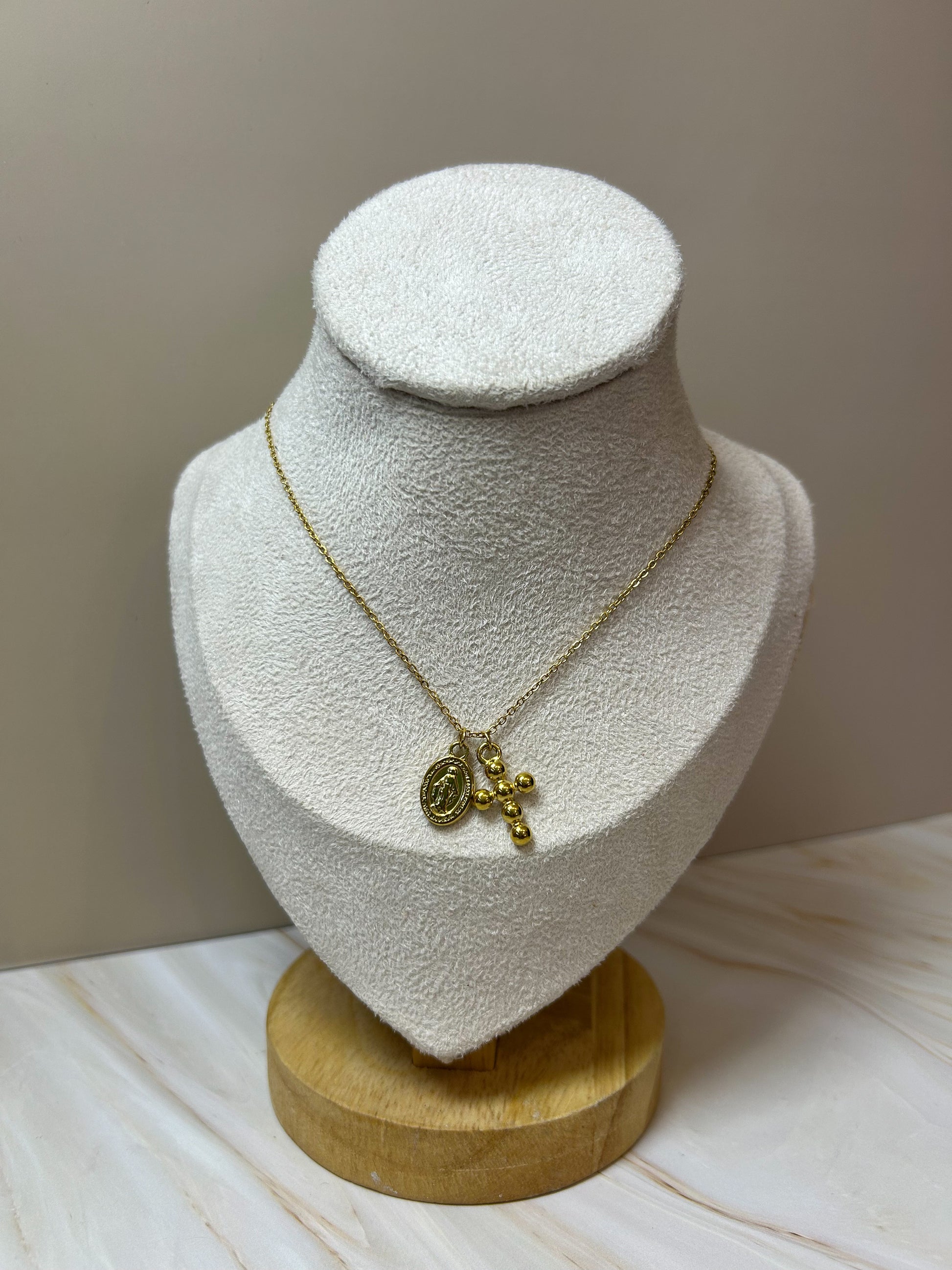 bello collar en tono dorado con detalle de una cruz tipo borlitas y una imagen religiosa, muy significativo pero nice . De acero inoxidable ✨