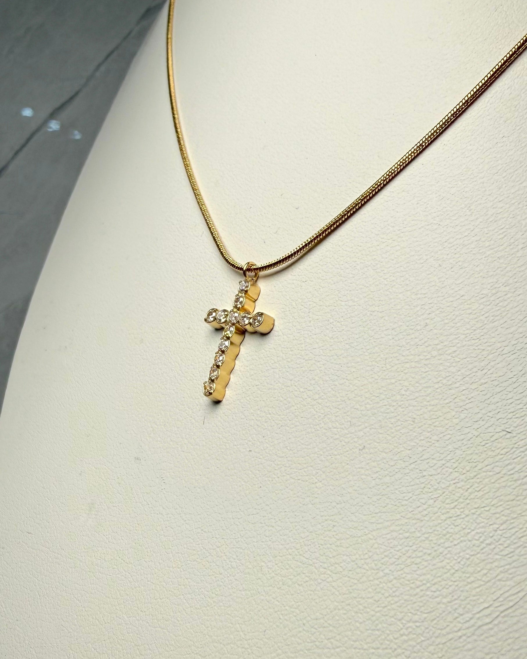 Lindisimo collar de cruz en tono dorado con detalles de cristales en la forma de cruz sencillo y elegante para darle un toque sublime . En acero inoxidable