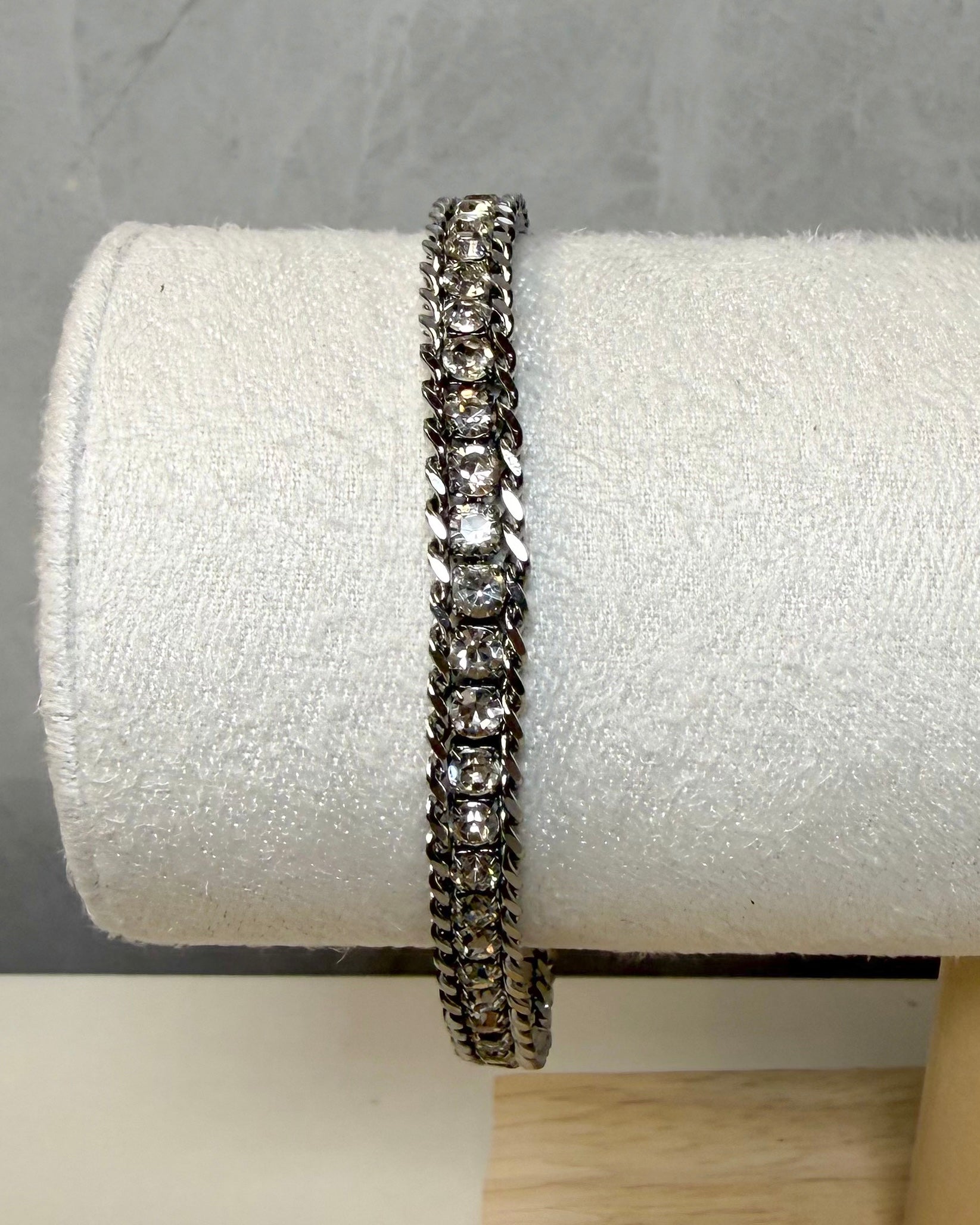pulsera tono plateado con detalles de cristales muy nice para lucir con tus looks. En acero inoxidable