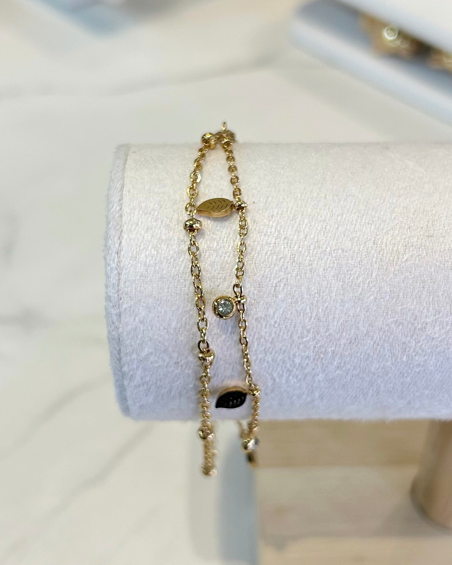 pulsera doble con detalles de hojas y cristales en tono dorado , sencillo pero muy nice para tus looks . En acero inoxidable