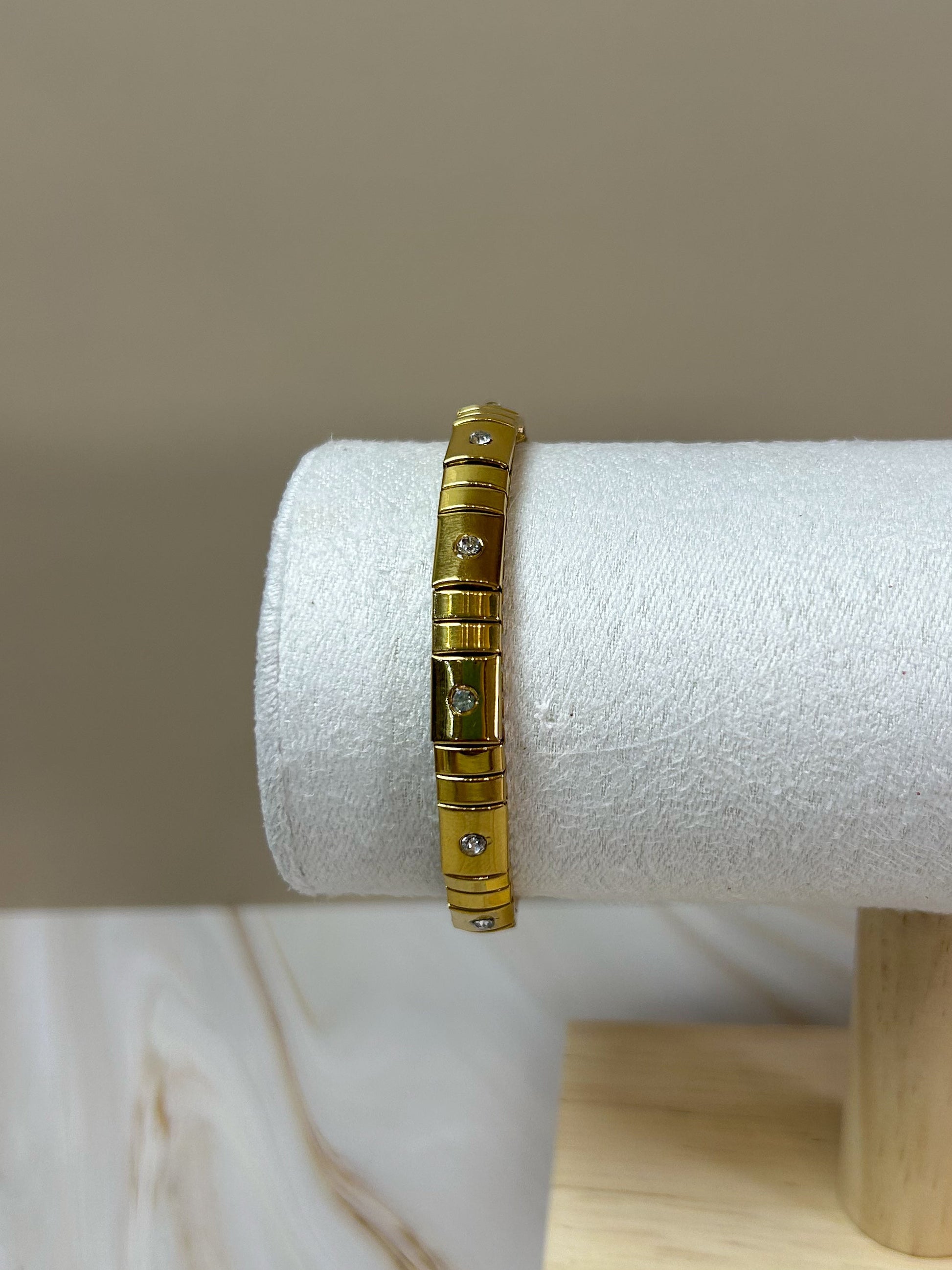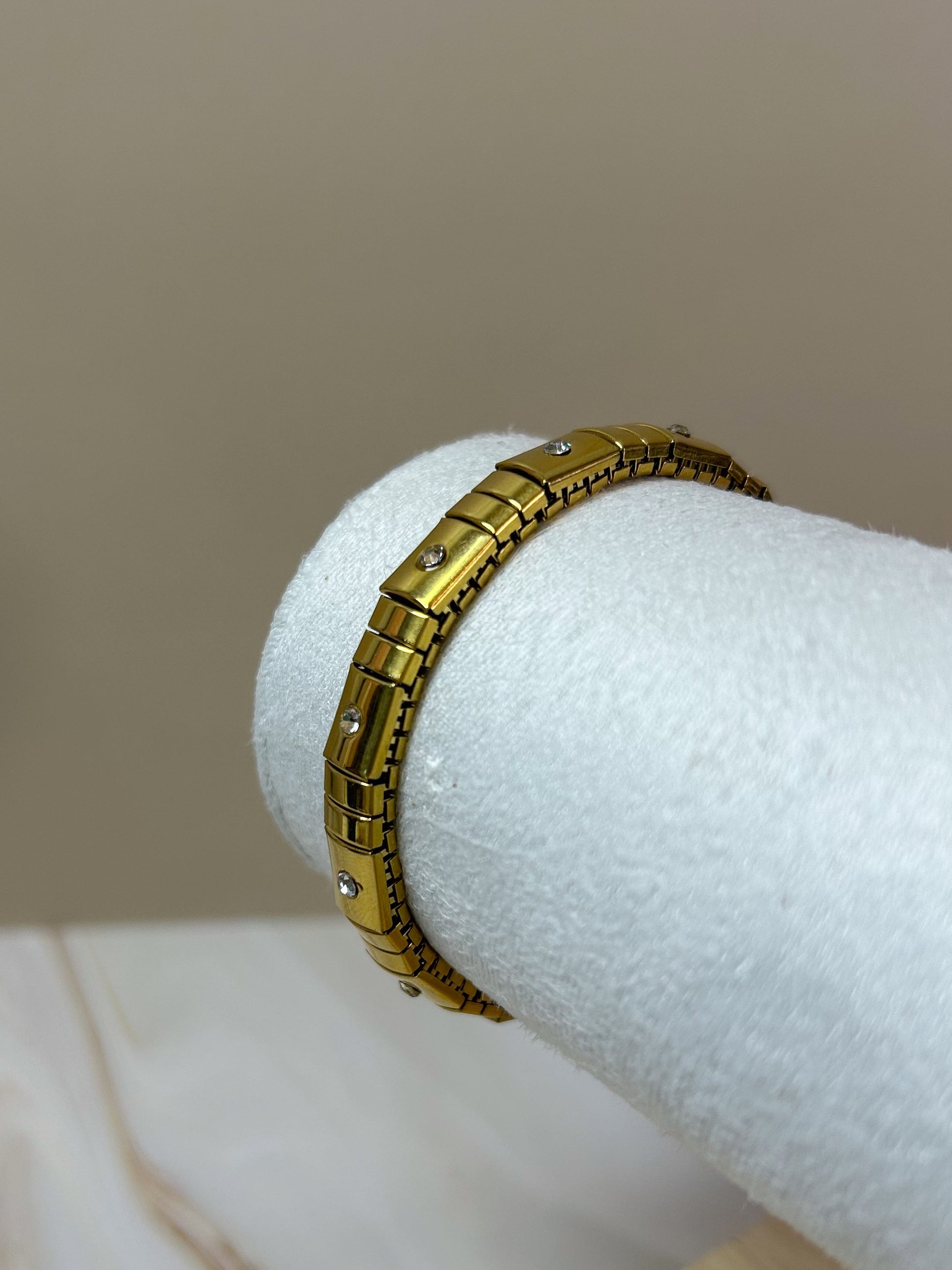 Pulsera en tono dorado con detalles de cristales, además es elástica y ajustable✨