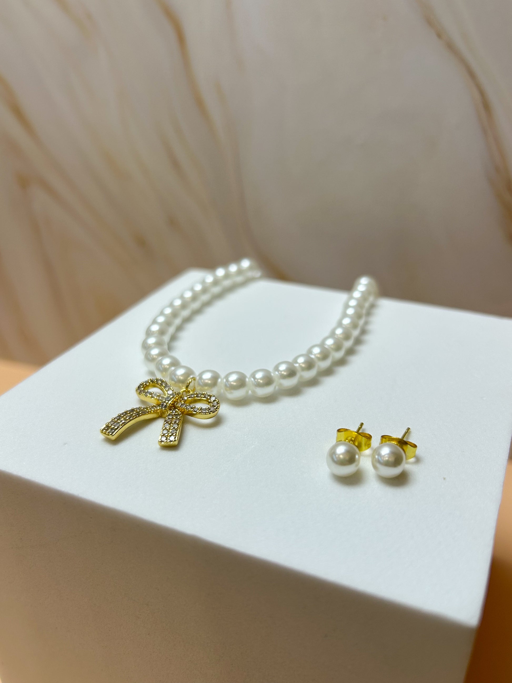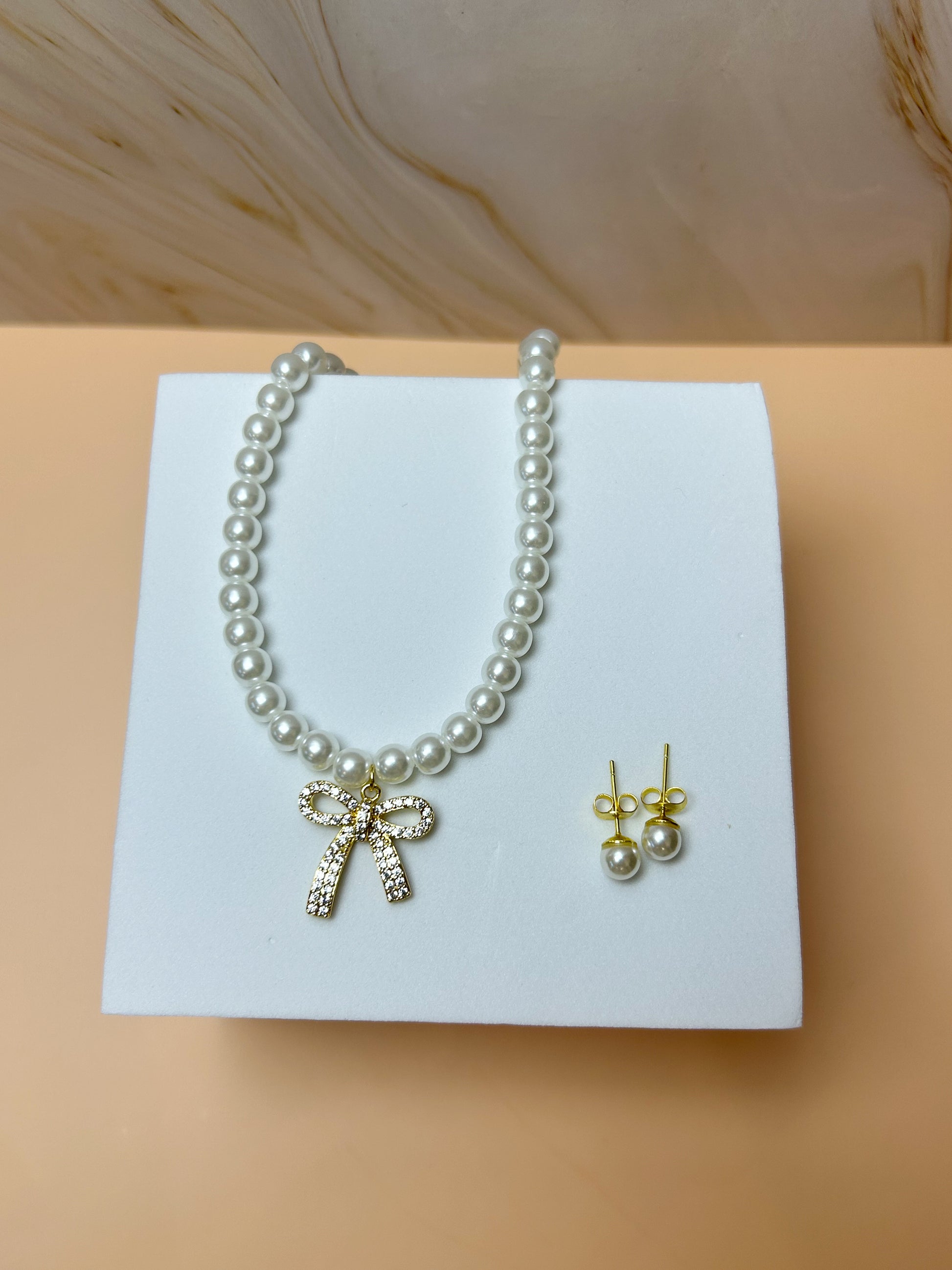 Hermoso set de collar y aretes de perlas con detalle de moño , para tus looks brillantes y elegantes ✨👌🏻