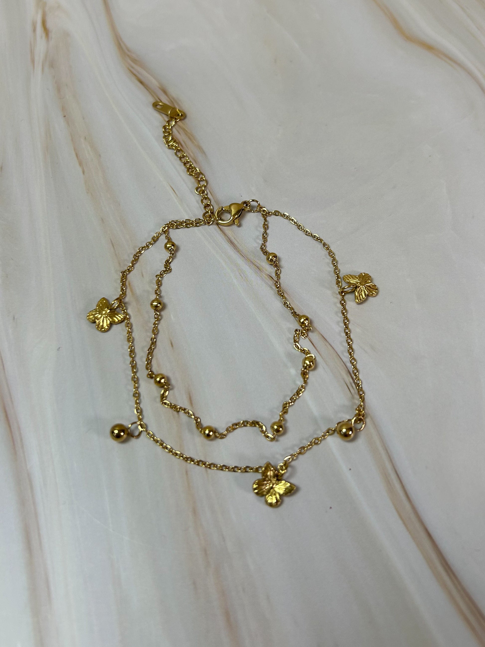 tobillera doble en tono dorado con detalles de mariposas y bolitas en tono dorado , para lucir nice tus tobillos ✨
