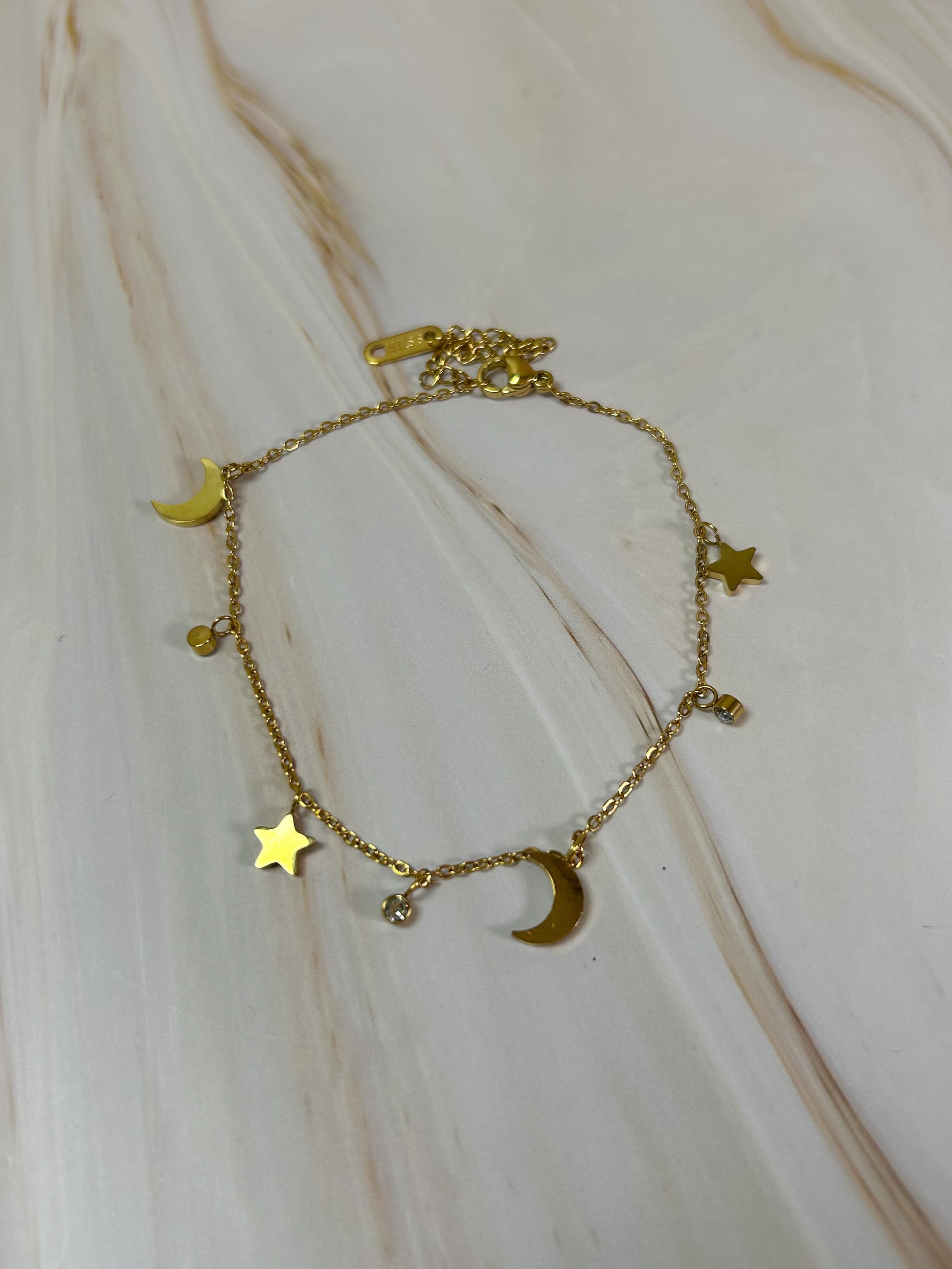 tobillera en tono dorado con detalles de luna, estrellas y cristales , cool para tus tobillos ✨